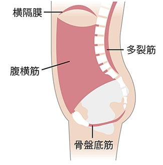 骨盤底筋には、腹圧を一定に調整する役割もあります。腹圧とは、おなかの中の空間を保つ圧力のこと。骨盤底筋は、肺呼吸に関わる横隔膜、おなかの腹横筋、背中の多裂筋とともに腹圧を調整しており、体幹を構成するインナーマッスルとも呼ばれます。